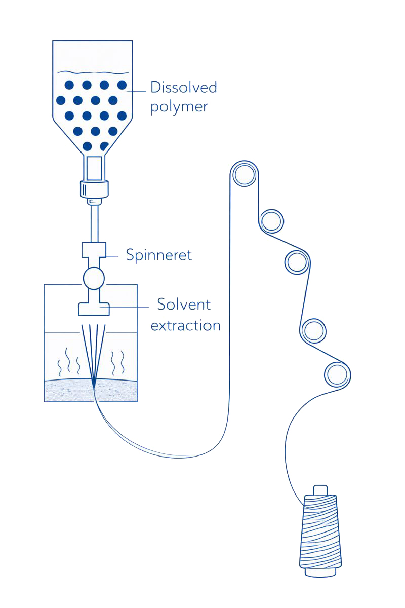 - Polymers are dissolved in solvent and extruded directly into a liquid bath