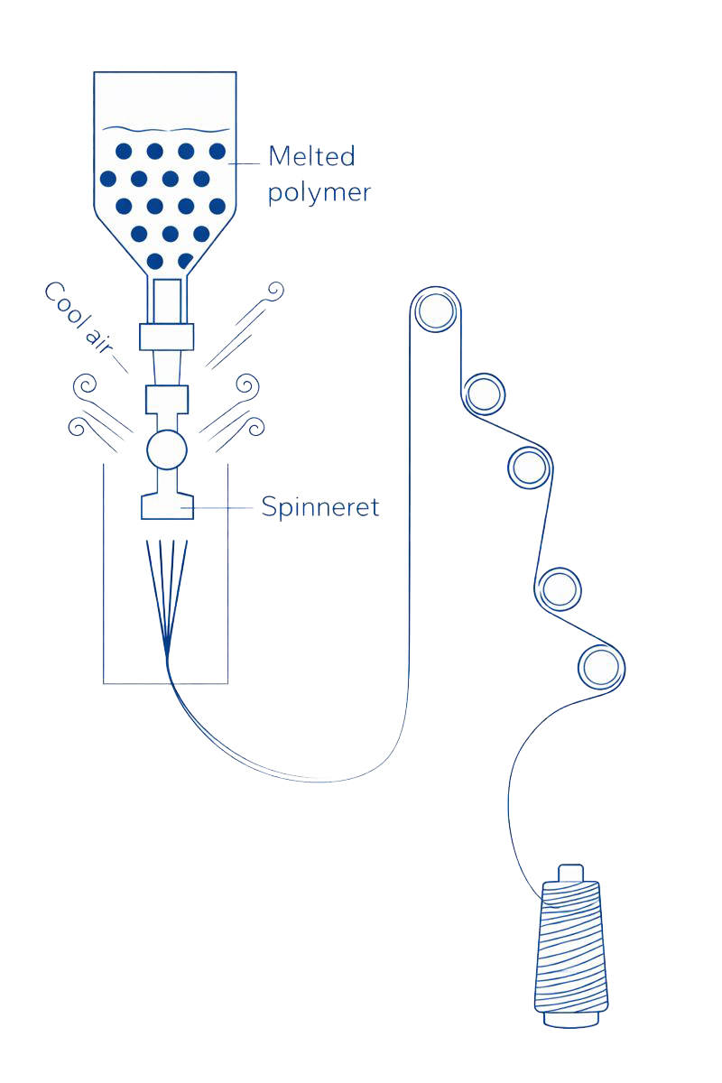 - Polymer granules are melted and then extruded through the spin head