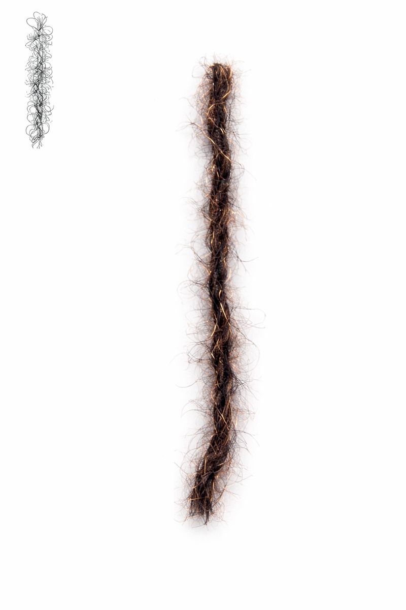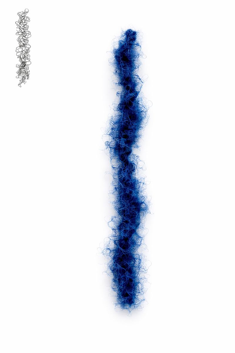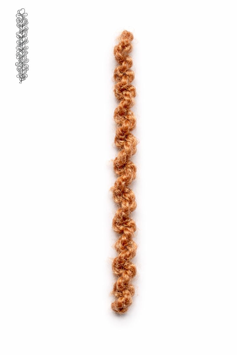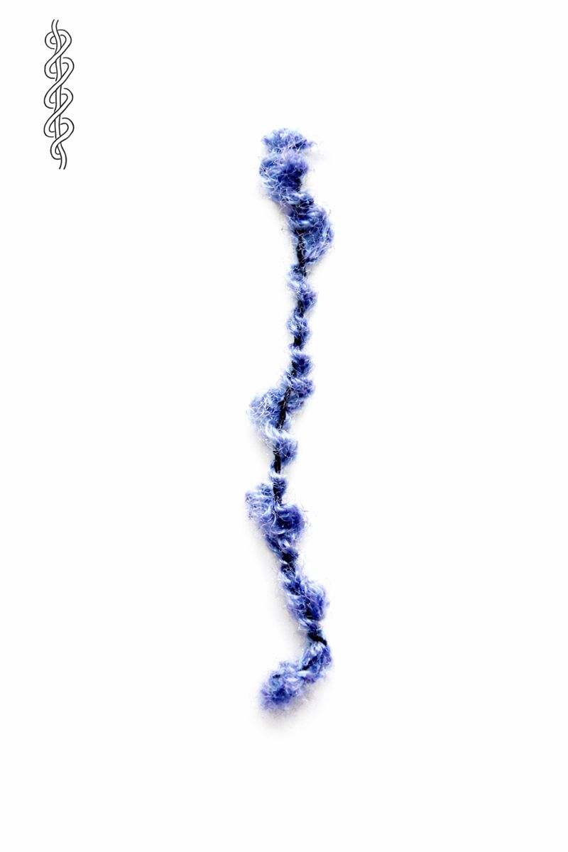 Highly twisted yarn that forms lively, irregular curls and snarls.