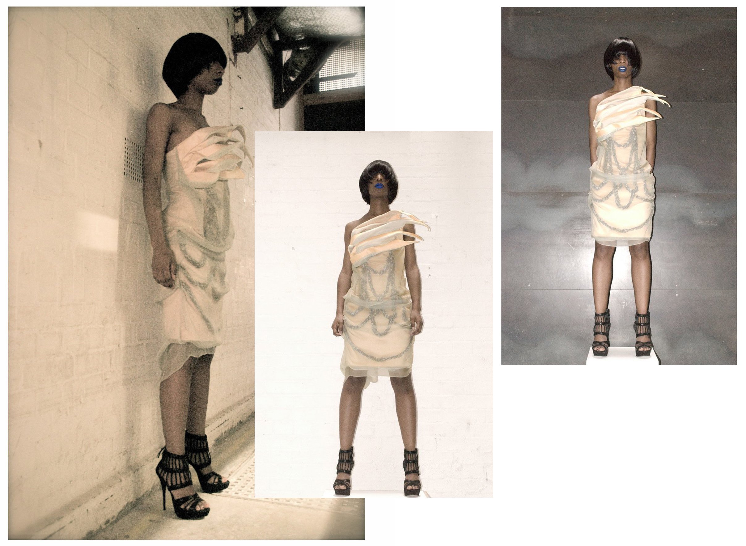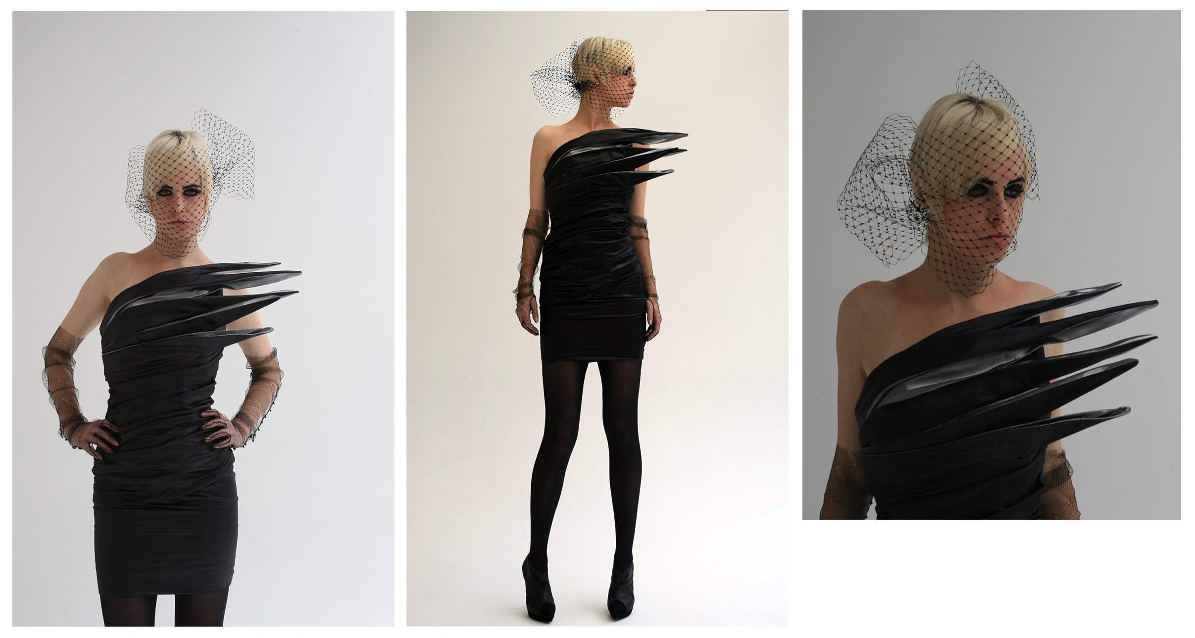 ‘Feathers’ and main ruched piece are cut on the bias. The designer recommends binding boning into ‘quills’ for best results.