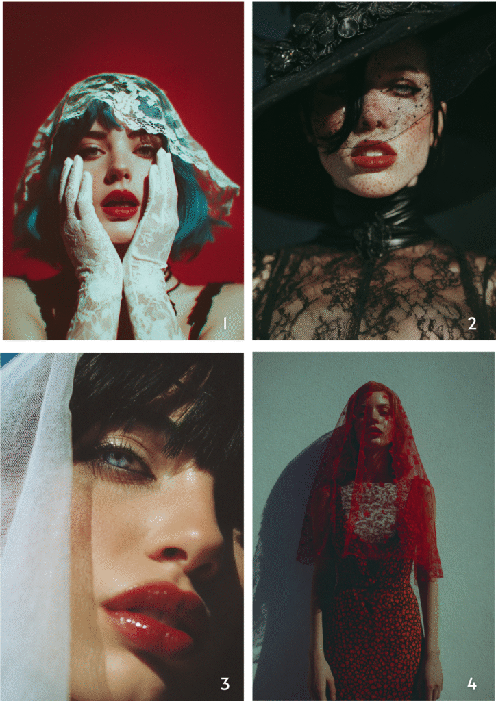 Prompts:1. A close-up, half-body shot of a woman with blue hair wearing white gloves and red lipstick. She is holding her face in front of…