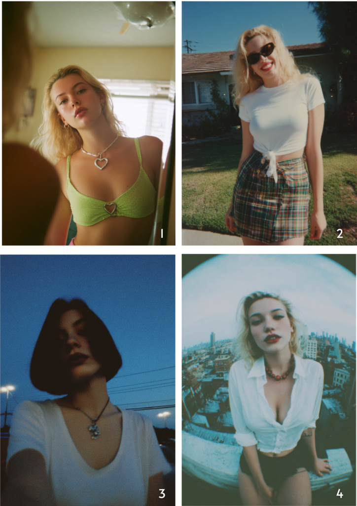 Prompts:1. A photograph of an alternative-style girl wearing a red top and sunglasses, posing in her bedroom at night. Shot on a disposable camera with…