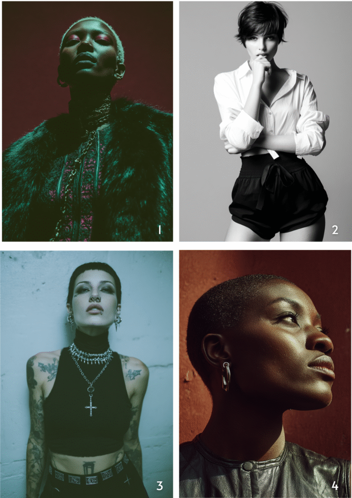 Prompts:1. A pale model with short white hair and purple eyes, wearing an elaborate green fur coat adorned with metallic pink patterns, featuring bold shoulder…