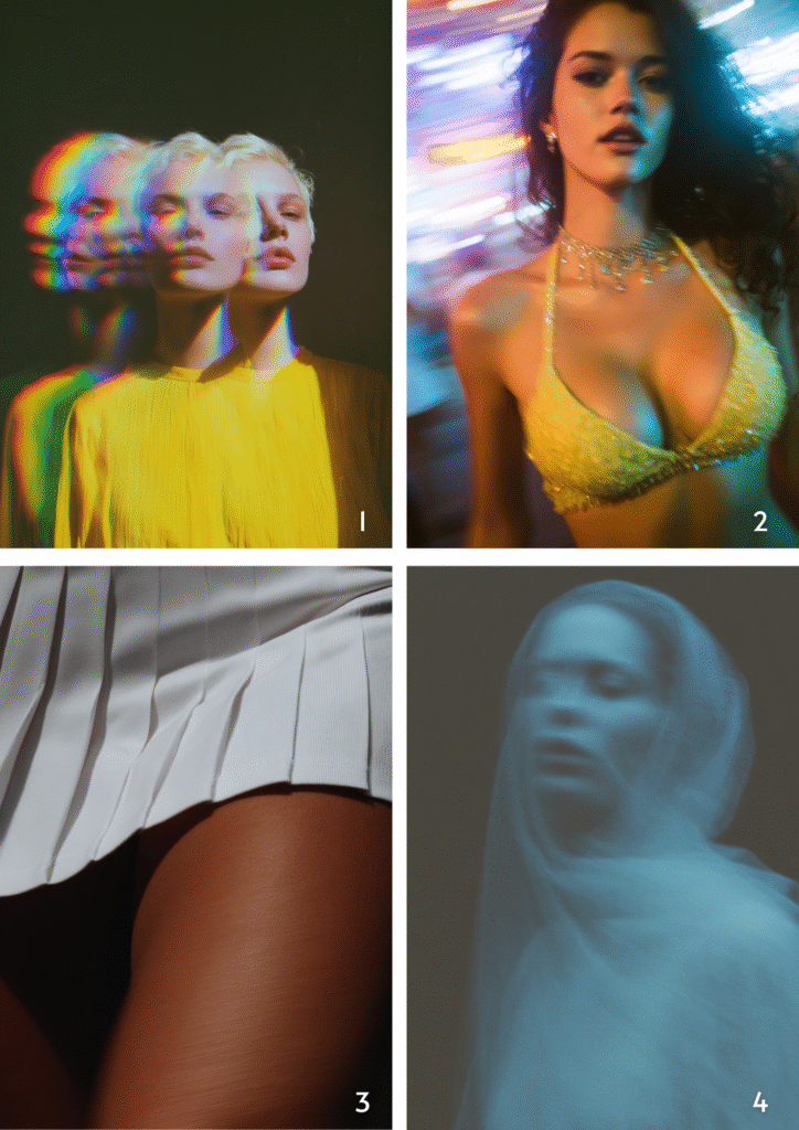 Prompts:1. Three blondes with short hair wearing yellow and green , with rainbow light reflections on their faces, in the style of surreal fashion photography,…
