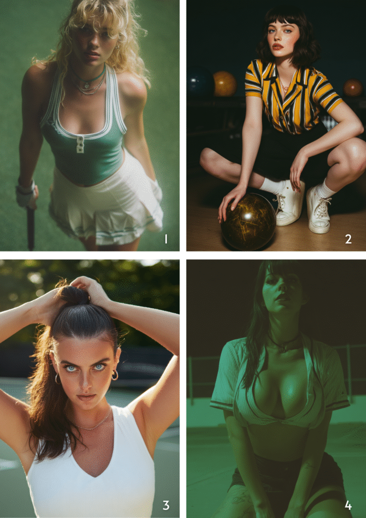 Prompts:1. Photo of a blonde woman in a green and white tank top and wearing a skirt, holding a golf club on a golf course.…