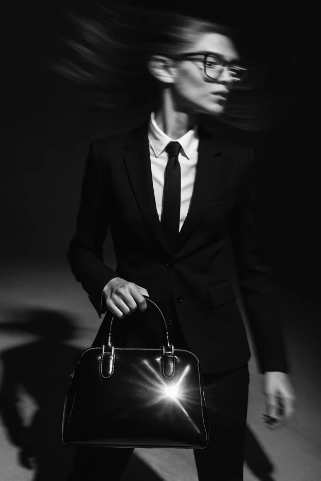 A woman in sharp black tailored suit, slim tie, oversized glasses. Studio spotlight burns harsh highlights on her glossy bag. Camera rushes upward in rapid motion, then snaps into slow focus. Her head turn leaves ghost trails, glasses flare silver, her shadow stretches dynamically across the floor. Motion blur streaks and shaky handheld energy emphasize power.