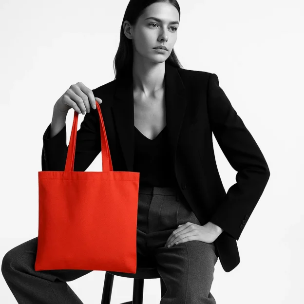 Create an ultra-realistic, high-fashion editorial photo of a female model sitting on a stool with a relaxed but elegant pose. naturally holding a tote bag with relaxed hand . The tote bag should be the only colored element, in #F8481C, while the rest of the image—including the model, clothing, stool, and background—remains black and white for a striking contrast. The background must be pure white with professional studio lighting, sharp focus, soft shadows, and a polished, magazine-style aesthetic. The final image should look authentically photographed, with the tote bag seamlessly integrated into her hand as if naturally held.