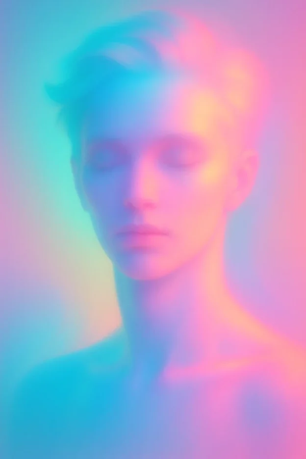A dreamy surreal portrait of an androgynous character with soft pastel neon gradients, glowing smooth skin in pink, cyan, and yellow tones, blurred minimal facial features, ethereal atmosphere, futuristic and vaporwave-inspired aesthetic, soft diffused light, abstract minimal digital art style, smooth flowing textures, cinematic composition, ultra high definition.