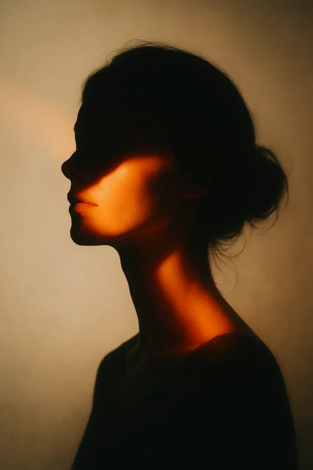 Create an artistic portrait of a silhouetted female figure with soft orange light (hex #C07858) projected across her face and neck. The scene is light and minimalistic, with gradient tones transitioning between cream and warm tones in the background. The light beam emphasizes the contours of her features, creating a surreal and ethereal effect. The style is cinematic and visually dramatic, focusing on light and shadow interplay.
