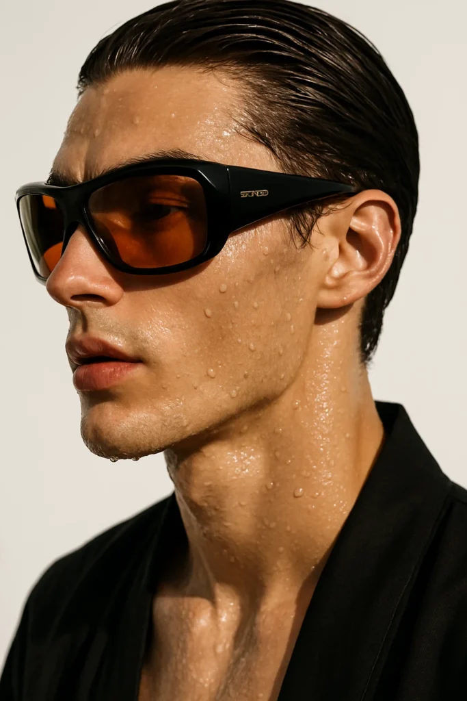 Ultra-close editorial portrait of the same male high-fashion model, captured from a left-side angle, showcasing sharp bone structure and wet, dewy skin with visible water droplets. The model wears oversized glossy black Tom Ford wraparound sunglasses with warm amber lenses. Hair slicked back, neat, slightly wet. Expression relaxed, mouth slightly open, full lips and striking jawline emphasized by directional sunlight from the upper left. Background clean white seamless. He is wearing a loose, flowing black kimono draped casually over his shoulders, adding contrast and a relaxed luxury aesthetic. Hyper-detailed skin texture at pore-level fidelity. Ultra-realistic, photoreal shooting style with strong editorial luxury campaign vibe.