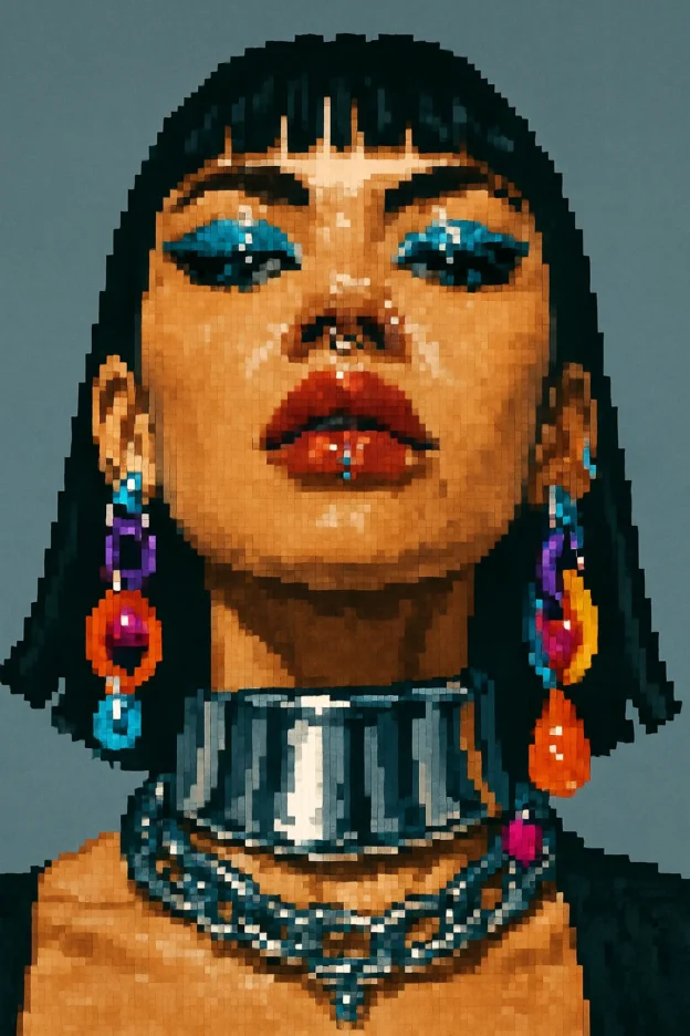 Hyperrealistic editorial fashion headshot of a female model, photographed on a professional DSLR with a wide 24mm lens, extreme low-angle shot from directly below, dramatic perspective distortion elongating jawline and accessories. Model looks directly into the lens with fierce editorial stare. Straight black hair with blunt bangs, bold Y2K makeup with glitter eyeliner and glossy lips. Prominent piercings: nose, lip, face. Oversized metallic choker and layered earrings dominate, mixing sleek chrome silver with bold colorful Y2K plastics and gems. Studio lighting with strong frontal key angled upward, crisp highlights on jewelry, balanced fill to preserve detail. Flat seamless gray studio backdrop, minimalistic. Cinematic color grading with jewel-tone vibrancy, glossy skin finish, high-end editorial retouch, subtle grain for print realism. Aspect ratio 4:5 portrait, high-resolution, commercial magazine style.