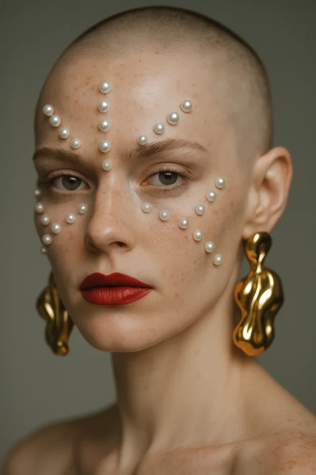 Close-up hyper-realistic portrait of a freckled model with shaved head, alabaster skin, pearls glued to forehead and cheekbones in geometric ritual-like pattern. Lips painted deep red, sculptural gold earrings. Shot on Sony A7R IV, 85mm f/1.2 lens, ISO 100. Neutral studio lighting with slight rim light. Vogue-style editorial photography, sharp focus on pearls, pores, freckles, ultra-detailed realism.