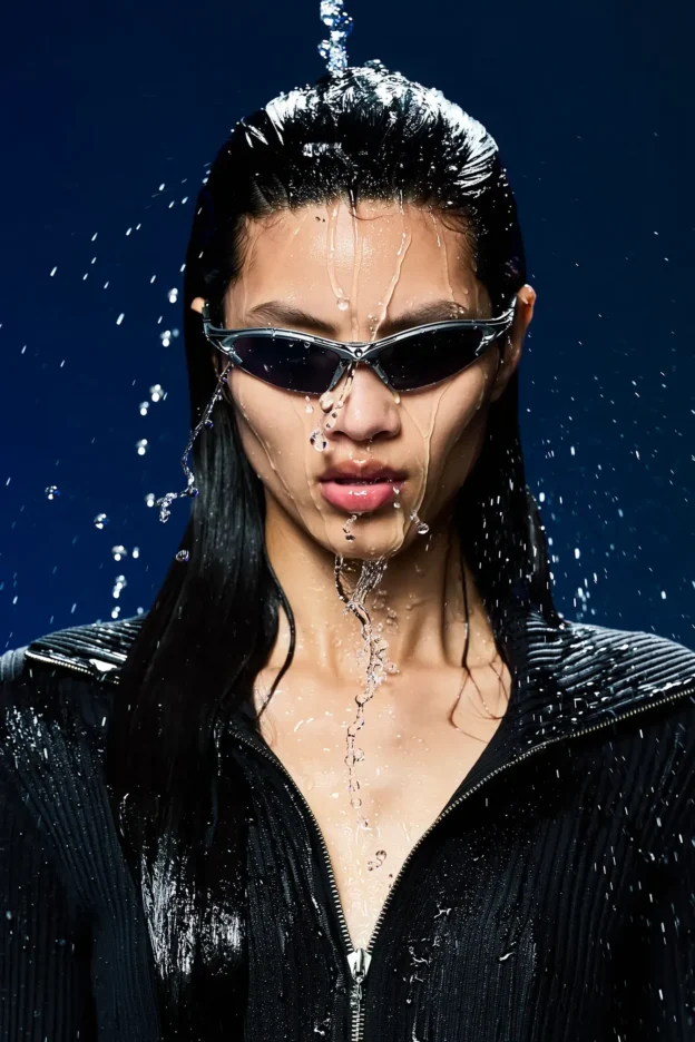 A hyperrealistic fashion portrait of a sharp-jawed model with slicked-back, wet hair and intense facial features, wearing futuristic, narrow black sunglasses and a zipped, black ribbed top with a plunging neckline. Water splashes dramatically in mid-motion across their face and chest, with sharp droplets frozen in time—some large and globular, others mist-like—and a clean, vertical stream running down the center of their face symmetrically. The lighting is high-contrast and clinical, emphasizing every water droplet and facial contour with vivid clarity. The deep navy blue background provides cinematic contrast against the sleek skin, black glasses, and sparkling water. The model’s expression is cold and focused, their skin showing natural texture and subtle imperfections, hair strands glistening authentically. The composition captures an intimate, spontaneous moment with a slightly off-center framing and casual angles, reminiscent of a high-fashion techwear campaign or sci-fi noir editorial, captured with the nuanced realism and natural lighting characteristic of an iPhone photograph.