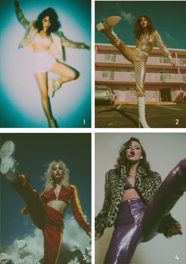 4. A full-body photo of a female model in a golden sequin jumpsuit with white boots, striking a kick pose, with a pink motel building in the background. the image has an 80s style, with a retrofuturistic and pastel color palette. the photography is hyper-realistic and highly detailed. –ar 85:128 –profile brezgf4 –stylize 300