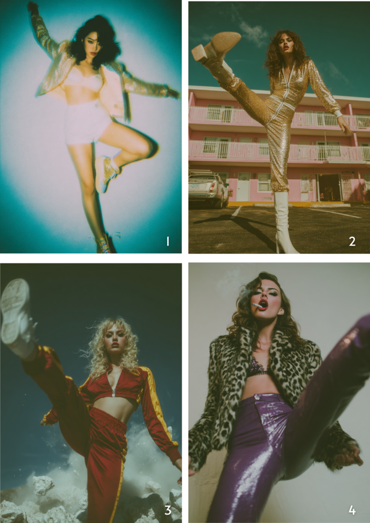 3. Female kick right leg high at camera in heels on a white soundstage, leopard fur coat, tight purple leather pants, black high heels, cigarette, dutch angle, mobster mistress editorial, action still high speed capture roundhouse kick –ar 2:3 –profile brezgf4 –stylize 800