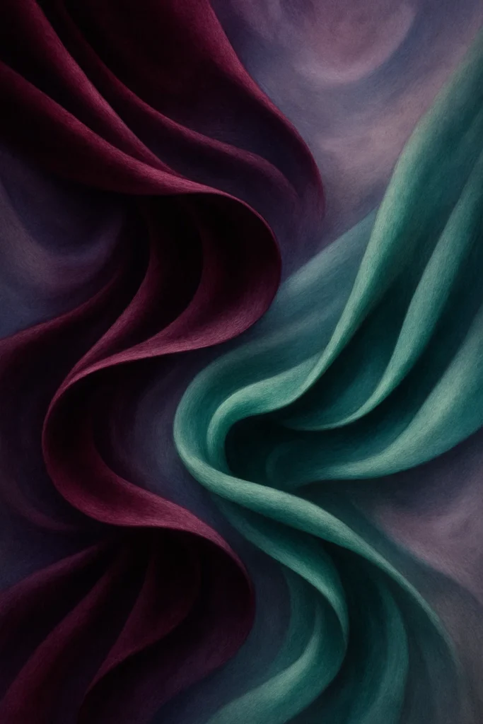 Elegant abstract drapery study, suggesting velvet’s tactile flow, with folded waveforms in velvet plum and jade green tones, enhanced by light purple-gray mist layers and dynamic gradients resembling luxury silk movement, modern textile-inspired composition.