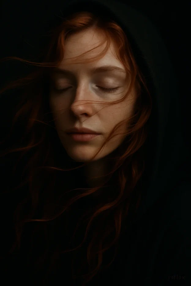 Intimate close-up of a woman in her late twenties with flowing natural red hair, eyes closed, expression peaceful yet introspective. her face is partially obscured by windswept strands of hair, creating organic visual rhythm. her pale freckled skin and softly closed lips glint subtly under soft directional light. she wears a dark hooded cloak that merges into the black background, giving the impression she is emerging from shadow. her hair catches the warm highlights, while the overall tone remains moody and cinematic. focus is shallow, framing tight on face and hair, evoking raw emotion, mystery, and timelessness. a very small ‘r410a’ faintly handwritten in lower right.