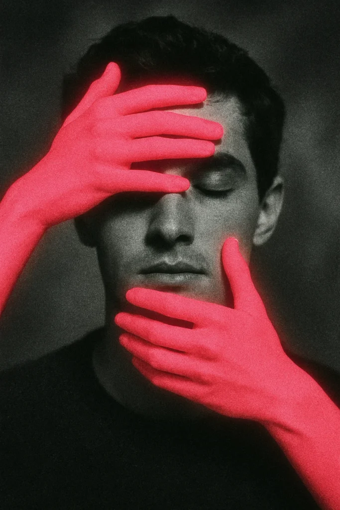 Surreal art photograph of a young man with closed eyes, captured in monochrome. Two bright neon pink hands cover and frame his face, creating a strong visual contrast. Conceptual and thought-provoking modern photography.”