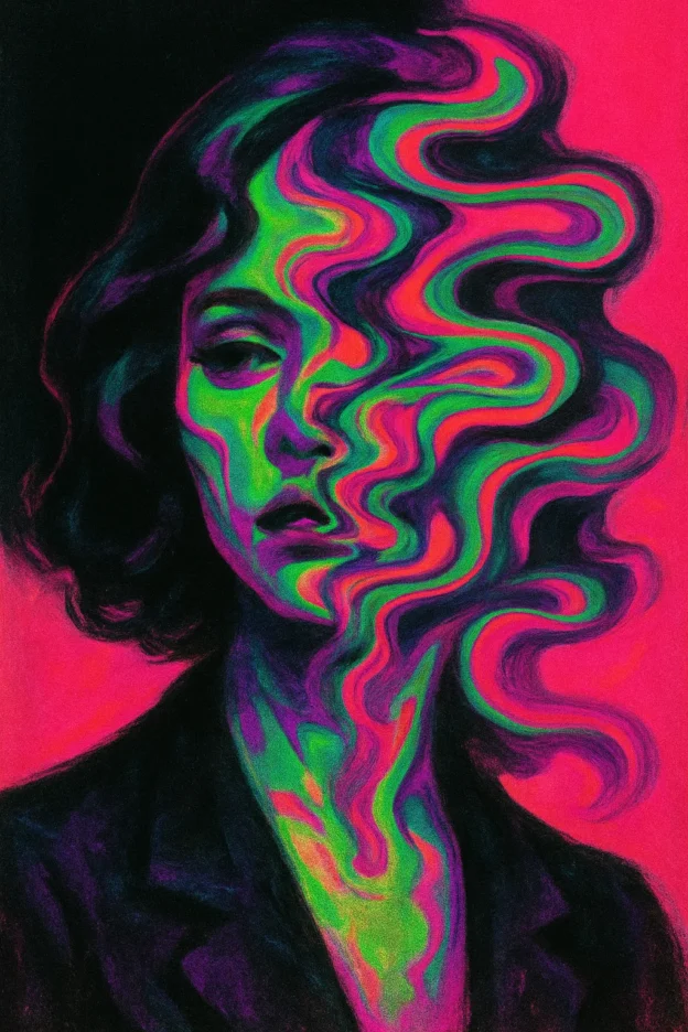 A surreal, psychedelic portrait of a woman with abstract, distorted facial features. Her face is partially obscured by swirling, fluid shapes in vivid neon colors such as magenta, green, and purple, creating a melting, dreamlike effect. The background is a bold contrast of deep black and hot pink, emphasizing the mysterious, avant-garde style. The overall aesthetic is retro-futuristic with a grainy, vintage film texture, evoking a sense of eerie elegance and abstract beauty