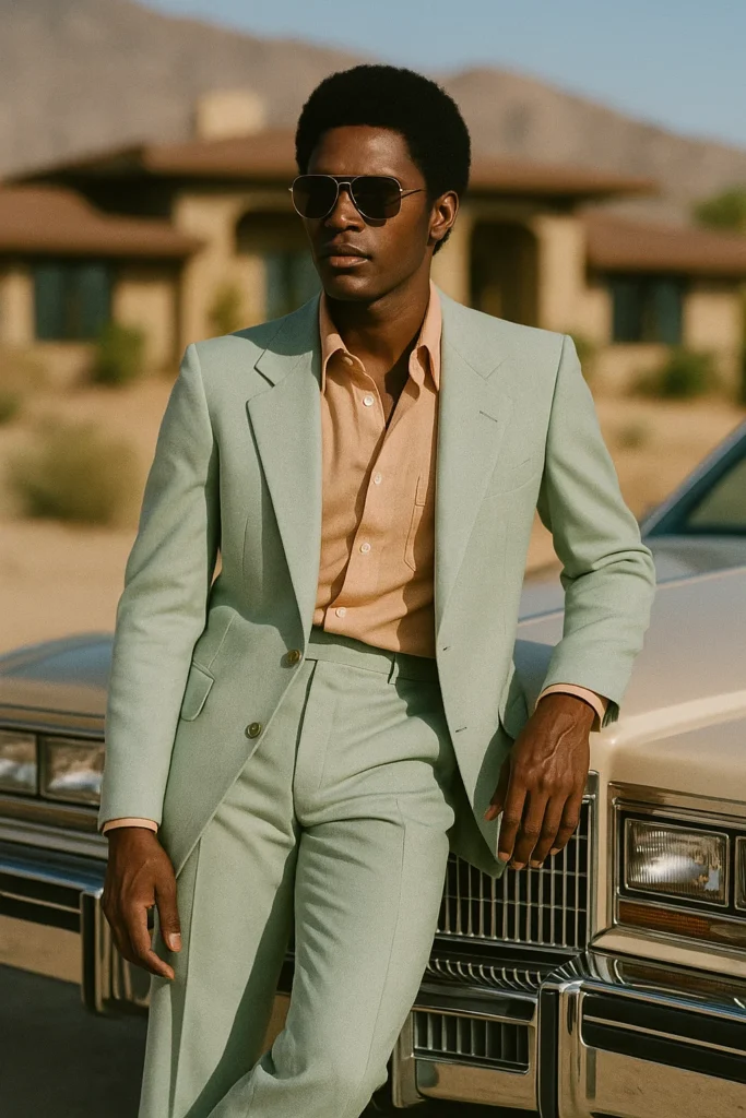 Fashion portrait, Canon AE-1 with 85mm lens, Kodak Portra 160 film, man in tailored pastel 70s suit, aviator sunglasses, leaning on Cadillac, desert villa blurred behind, cinematic editorial look, hyper-detailed textures of fabric and chrome, vertical 9:16