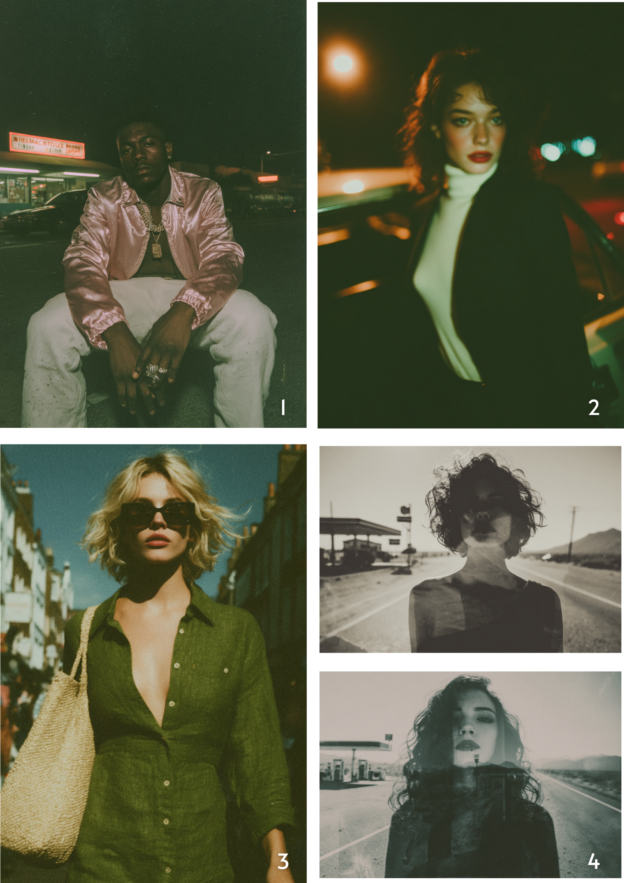 4. A black-and-white double exposure of an attractive woman with wavy hair wearing dark , standing in the middle of a desert road. A gas station is visible on the left side of the street. The shot is wide, taken with a Canon EOS camera, with film grain, volumetric lighting, and cinematic lighting, resulting in a hyper-realistic effect. –ar 128:71 –profile 2auet8e