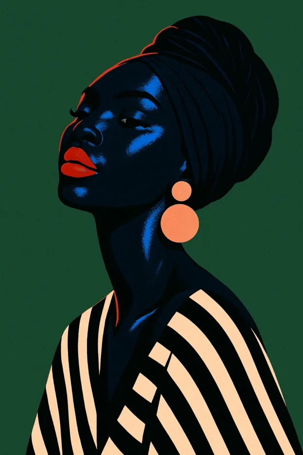 A bold and elegant digital illustration of a stylish Afro-American woman with deep, glossy black skin highlighted by vibrant electric blue reflections. She has a confident and graceful expression, with her head slightly tilted back and eyes gazing upward. Her lips are painted a vivid red, adding a striking contrast to her dark complexion. She wears a large, round peach-colored earring and is draped in a minimalist black and white striped garment. Her hair is wrapped tightly in a dark headscarf with subtle linear texture, outlined with a soft red line. The background is a solid deep green, enhancing the modern and minimalist aesthetic. The overall style is flat, graphic, and editorial, with smooth color blocks, high contrast, and a sophisticated, fashion-forward mood.
