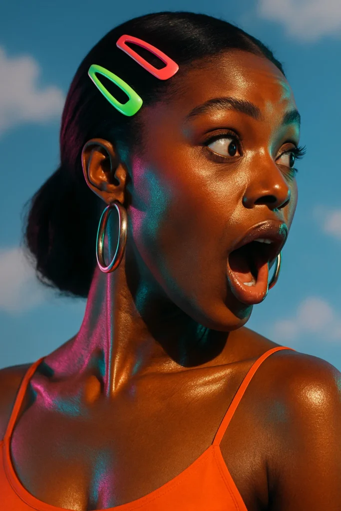 A hyper-stylised but photorealistic close-up portrait of a stylish young woman with dark skin and glossy highlights, captured in a bold surprised expression with her mouth open and eyes wide. She is angled 3/4 and not looking at camera. She wears large silver hoop earrings and a sleek strappy top in a bold solid color. Her hair is styled with a few oversized neon hair clips that pop against the minimal background. The background is generic and soft — a blue sky with clouds, no distracting details. Lighting is strong and cinematic, with subtle 80s chromatic glows enhancing her skin and accessories. Shot in crisp natural detail, with realistic textures, wide-angle depth, and dramatic focus that makes her expression and styling feel larger-than-life. The mood is bold, playful, and stylish — consistent with the series’ photorealistic yet hyper-stylised tone.