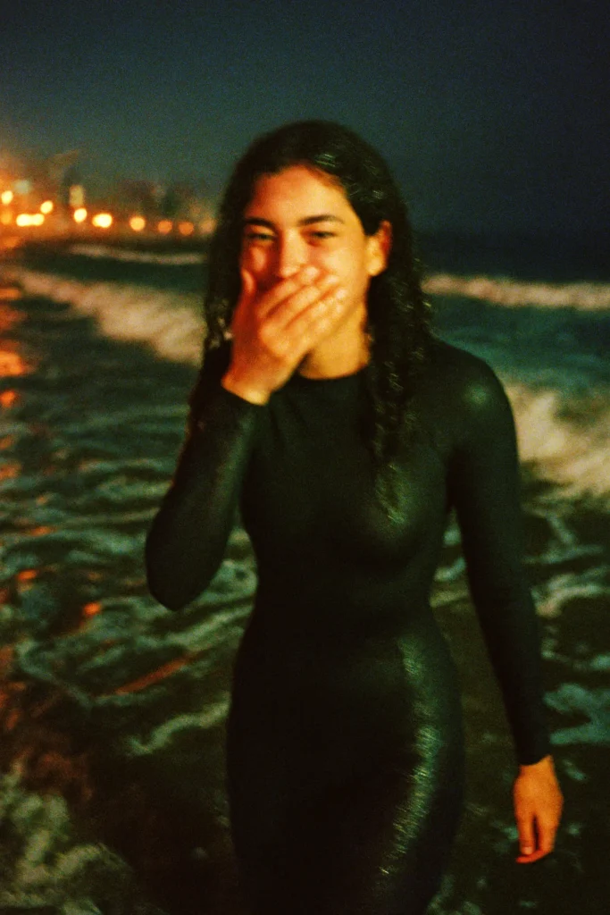 Juhu beach (Mumbai, India). waves coming in. night time. looks like it was shot on 16mm film, very grainy. handheld camera movement. Bright saturated colors. (sin texto en la imagen)Italian-iranian model returning tired from surf session, covering her mouth to conceal her laughter, she is away from camera, in the water, but facing me, happy. Here face is 30% motion blurred.