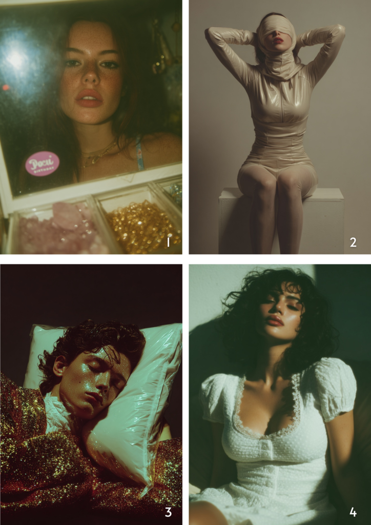 2. Photorealistic full-body portrait of a woman sitting on a white box, wearing a beige leather suit and tights/pantyhose, with her hands behind her head covering her face with a cloth. The lighting is soft, with neutral tones and a beige background, shot from below. –ar 1:1 –profile m1axx8a