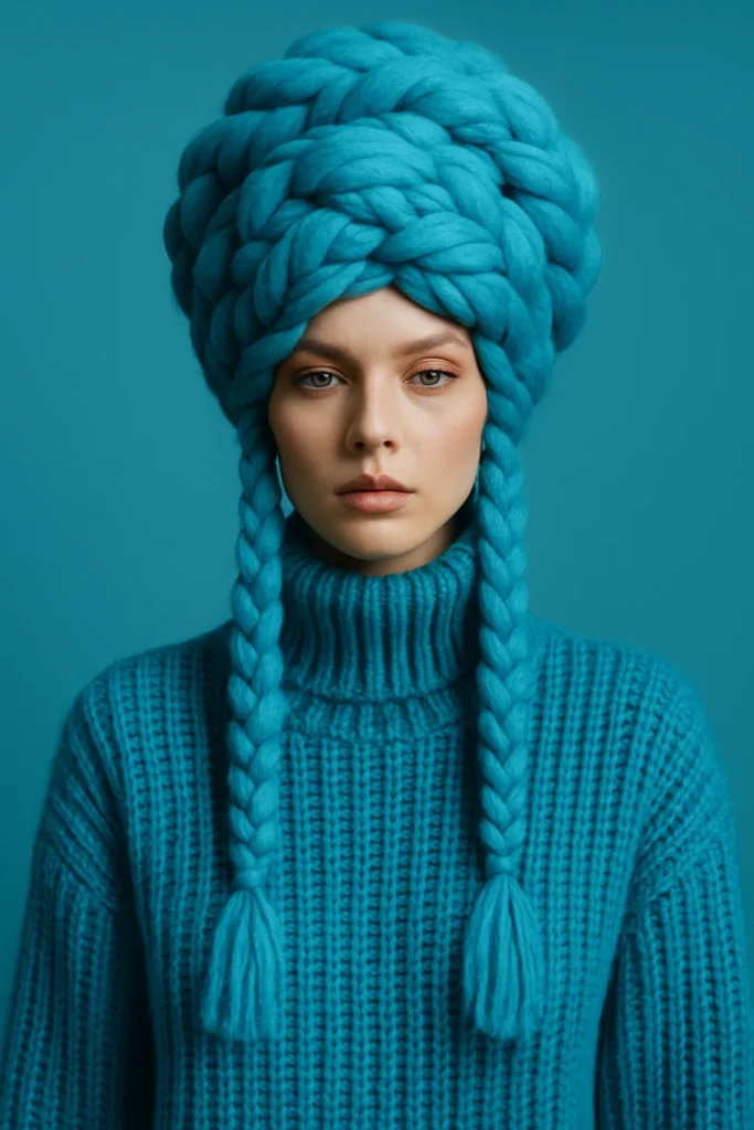 A high-fashion portrait photograph against a solid turquoise blue background. The subject wears an oversized chunky knit turtleneck sweater in a matching turquoise blue color. The most striking feature is a large, sculptural headpiece made of thick braided yarn in the same blue shade. The headpiece is styled in a turban-like formation with two braided strings that fall down the front of the face. The lighting is soft and even, creating a professional studio-quality look. The photograph has a modern, editorial style with sharp focus and rich color saturation. The composition is centered, with the headpiece taking up approximately one-third of the frame at the top. The sweater has a ribbed knit pattern and extends down to the bottom of the frame. The overall image has a monochromatic blue color scheme with variations from light to deep turquoise.