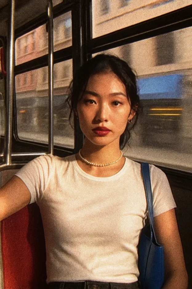 A video filmed with a 1990s consumer video camera, creating a noticeable vintage look with strong grain texture, visible video noise, and occasional flickering. The lighting is harsh and direct, casting strong highlights and deep shadows on the subject’s face and clothes, adding dramatic contrast. The scene shows a stylish young Asian woman supermodel sitting inside a moving city bus. She has fair skin, dark brown eyes, and natural makeup with bold dark red lipstick. Her hair is black, slightly wavy, tied back in a messy low bun, with loose strands falling softly around her face. She wears a fitted plain white t-shirt that catches the light and shows mild shadow contours, a delicate pearl choker necklace, and a royal blue shoulder bag with a thin strap. She leans casually to one side against the window bar, creating a relaxed, elegant posture. The bus interior is modern, featuring metallic poles, large windows, and a red cushioned seat. Outside the window, the city blurs by, revealing urban scenery with beige and pink building facades, blue awnings, and streaks of yellow, emphasizing motion. The footage has a slightly jittery handheld feel, typical of 90s home video. Colors are slightly oversaturated and high-contrast due to the harsh lighting, giving a retro aesthetic. The camera slowly zooms in toward her face, focusing on her calm, confident expression, while the outside background continues moving.