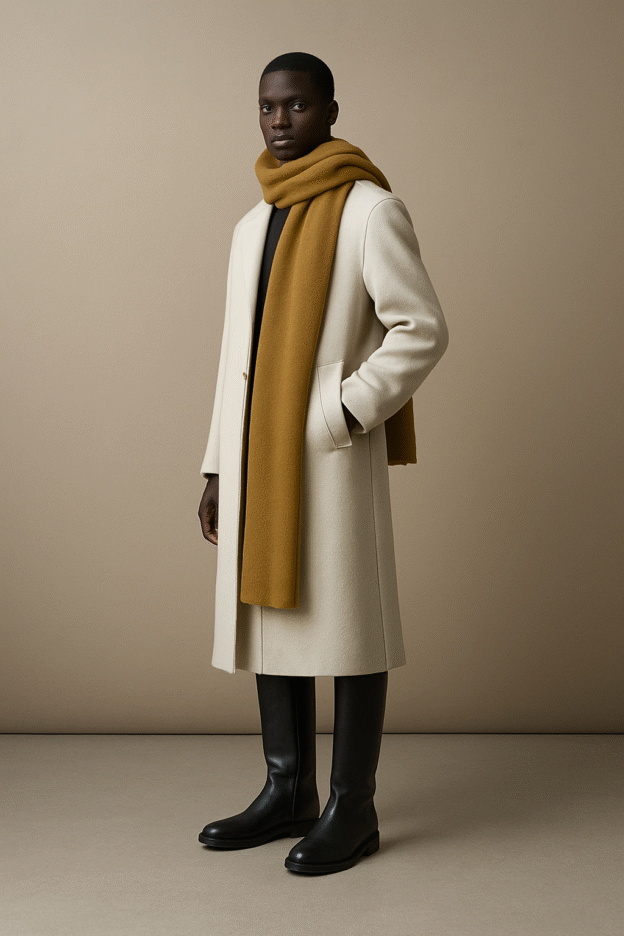 Futuristic Nordic editorial fashion photograph of a male model styled in a refined winter look. He stands in a minimalist studio with a smooth beige backdrop and soft, diffused daylight. The model wears a long, structured ivory wool coat with a straight, tailored silhouette, paired with a voluminous mustard-yellow scarf wrapped once around the neck and falling elegantly down the front. The textures of wool are tactile and hyper-detailed, contrasting the matte leather boots and clean lines of the coat. Lighting is cinematic yet soft, creating subtle shadows and highlights that accentuate proportion, fabric depth, and craftsmanship. The mood is calm, modern, and editorially sophisticated — a balance between warmth, precision, and Nordic quiet luxury.