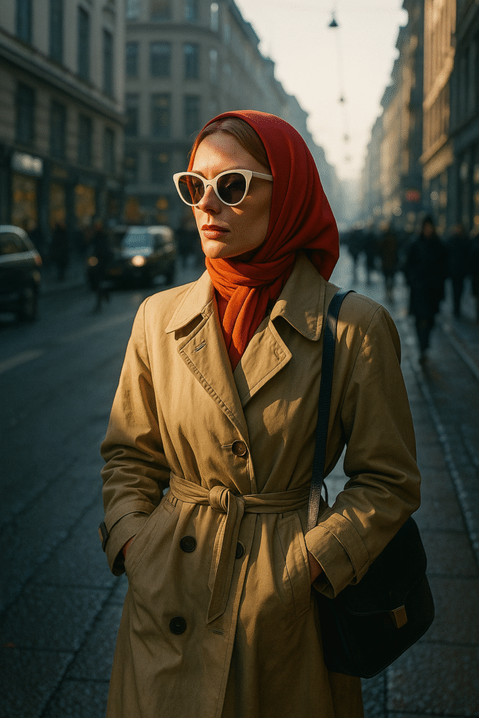 This is winter in a busy morning street in Copenhagen, there is a ray of winter which illuminate the face of the scandinavian woman walking down the street. She wears a red headscarf, We can’t see her hair. she looks in hurry but at peace at the same time. She has her vintage sunglasses from 60′ (Françoise hardy style) on, the sunglasses have white frames. She has a vintage trench coat (Jane firkin style in the 80’s). She is stylish and minimalist. She carries a shoulder bag Céline style (Phoebe Phil era). Image is ultra detailed, hyperrealistic 8K, cinematic.